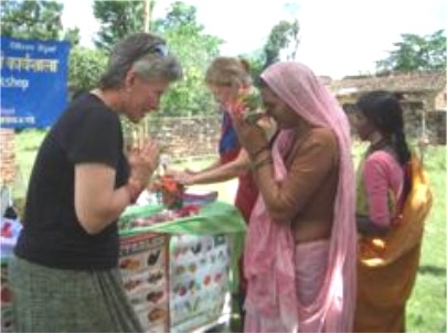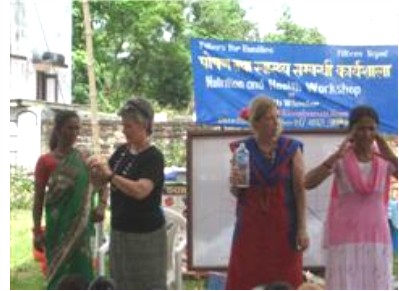 From time to time we get help for our program from volunteers. During September, Patti Wheeler, a nutritionist from Georgia (USA), conducted a special Nutrition and Health Workshop for village women. The workshop was held in Kunwar, the first village in Nawalparasi to receive filters. The workshop focused on the elements of good nutrition, personal hygiene and the importance of a woman in her community. The women enthusiastically celebrated the workshop by presenting Patti and Linda with flowers, fans and baskets.